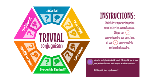 Parcours de révision sur la conjugaison française. Adressé aux élèves de cycle 4 et lycée, ce jeu "tempus" permet à l'élève de balayer tous les temps de la conjugaison française, les valeurs aspectuels des temps et les règles de concordance des temps. Réalisé avec l'aimable autorisation de Yann Houry auteur www.ralentirtravaux.com.